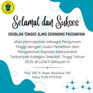 Sekolah Tinggi Ilmu Ekonomi Pasundan mendapatkan Penghargaan dari Ketua LLDIKTI 4 Jabar dan Banten untuk penerima Judul Penelitian dan Pengabdian Teranyak Untuk Kategori Sekolah Tinggi Se Jabar dan Banten Tahun 2025.